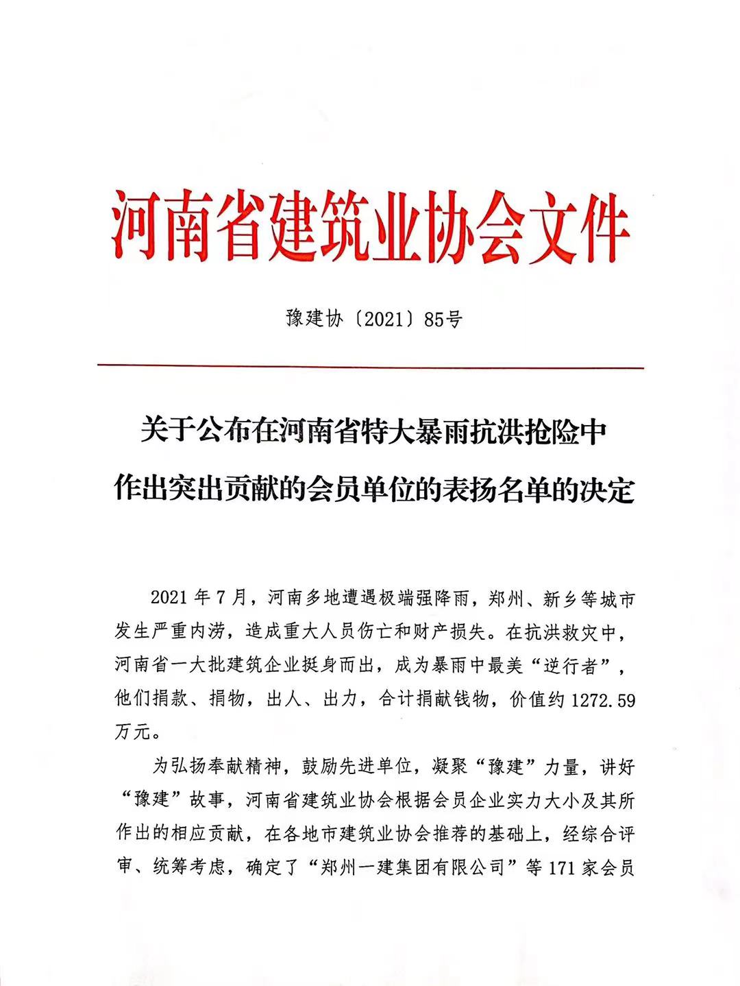 近日,河南省建筑業(yè)協(xié)會公布了在河南省特大暴雨抗洪搶險中作出突出貢獻的會員單位的表彰名單,公司榜上有名。