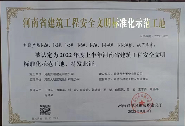 10月11日,公司承建的鶴壁凱旋廣場項目榮獲“2022年上半年河南省建筑工程安全文明標(biāo)準(zhǔn)化示范工地 ”稱號。自開工以來,項目部制訂了河南省安全文明工地創(chuàng)建計劃,成立了以項目經(jīng)理為組長的領(lǐng)導(dǎo)小組,將安全生產(chǎn)責(zé)任層層分解,保障安全文明資金專款專用,積極開展隱患排查治理、教育培訓(xùn)等工作,確保各項安全、環(huán)保工作落實到位。一直以來,公司高度重視安全文明工地的創(chuàng)建工作,項目開工前,明確約定創(chuàng)優(yōu)目標(biāo),對獲獎項目按規(guī)定予以表彰獎勵。同時,安排專人對項目創(chuàng)優(yōu)工作進(jìn)行跟蹤指導(dǎo),針對專家組提出的問題,督導(dǎo)項目部按期整改落實,確保通過率達(dá)到100%。經(jīng)過不懈努力,公司形成了比學(xué)趕超、爭優(yōu)創(chuàng)先的良好氛圍,工程項目建設(shè)創(chuàng)優(yōu)創(chuàng)杯能力大幅提升,樹好了“河南興瑞”品牌。 據(jù)悉,公司承建的鶴壁凱旋廣場是淇河邊新地標(biāo)建筑,建業(yè)集團(tuán)在河南的第六座凱旋廣場。坐擁淇河生態(tài)風(fēng)貌帶,臨河地塊,整體規(guī)劃47萬平方米,項目有有13棟樓,9棟住宅,2棟辦公樓,2棟公寓,集萃商業(yè)住宅公寓寫字樓等全業(yè)態(tài),約141米灣畔天幕雙子塔,名師打造,將為鶴壁在淇河打造天際線。其中目前正在施工的一期住宅樓1-2#、1-3#、1-5#、1-6#、1-7#五棟樓總建筑面積90951平方米,剪力墻結(jié)構(gòu),筏板基礎(chǔ),地上27層地下三層,建筑高度79.85米。一期1-1-A#寫字樓總建筑面積66390平方米,地上26層,地下2層,建筑高度141米;1-1-B#公寓樓總建筑面積129864平方米,地上17層,地下2層,建筑高度99.65米,目前寫字樓和公寓正在緊張的主體結(jié)構(gòu)施工中。