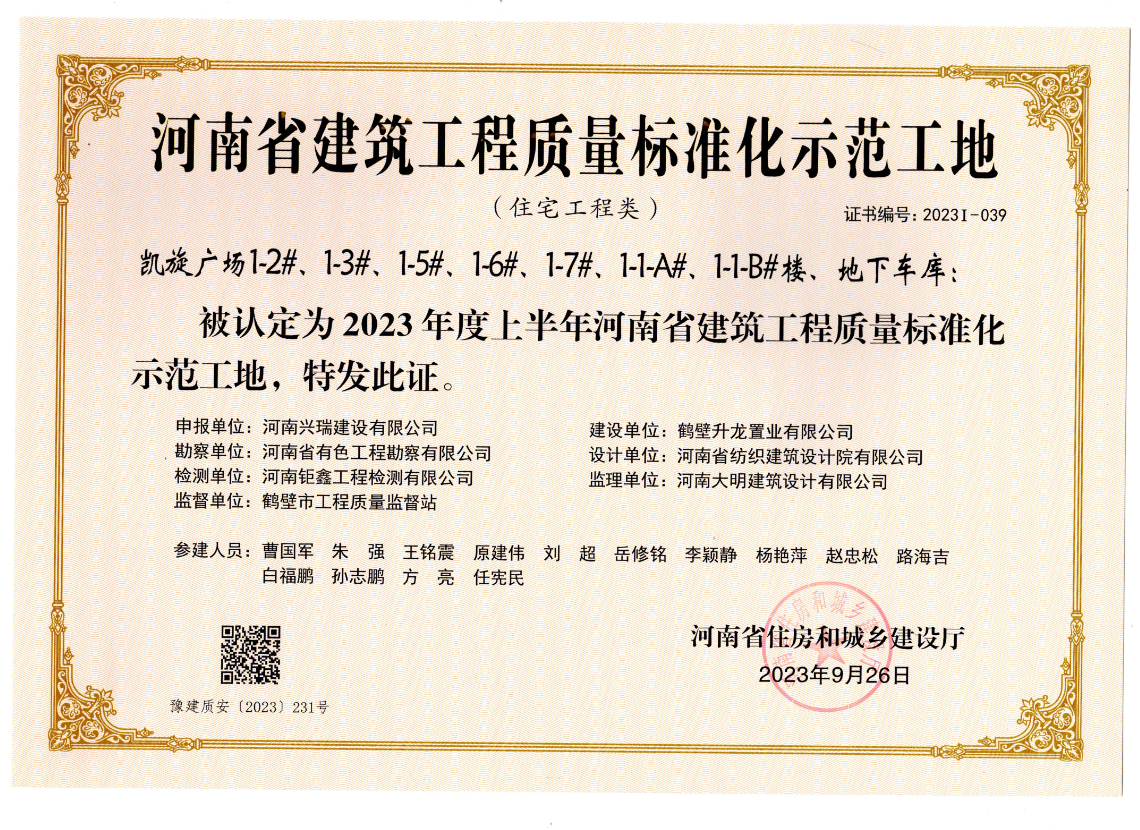 近日,鶴壁凱旋廣場項目榮獲“河南省建筑工程質(zhì)量標準化示范工地”稱號。該榮譽稱號由河南省住房和城鄉(xiāng)建設廳主導設立,旨在充分發(fā)揮質(zhì)量管理標準化先進典型示范引領(lǐng)作用,全面提升工程質(zhì)量水平。該榮譽每年評選兩次,自2020年設立至今已評選六屆。